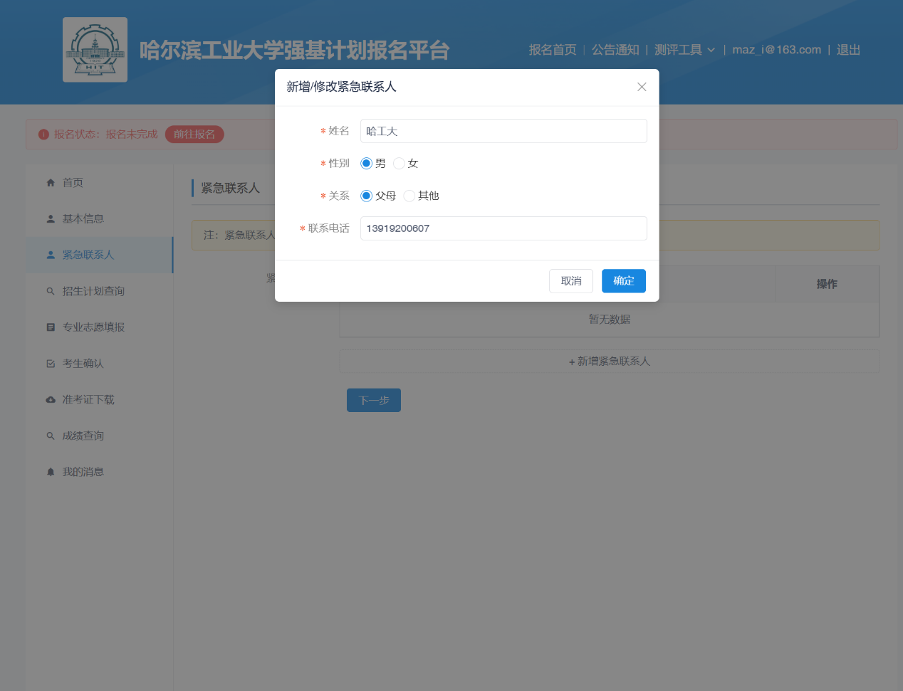 确认基本信息后,系统会提示填写紧急联系人,考生按自身情况填写即可。