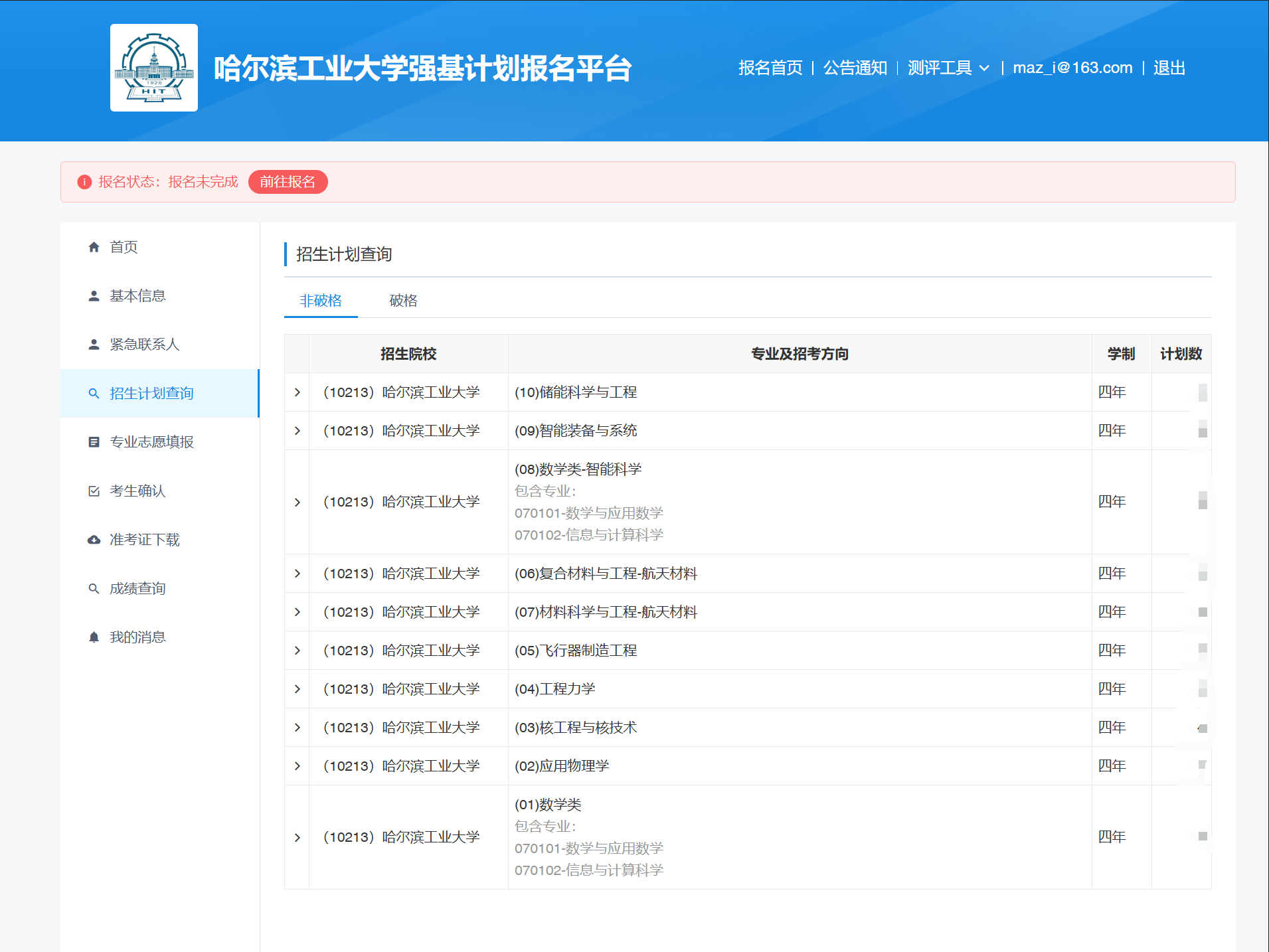 填写完紧急联系人后,系统会自动跳转到专业志愿填报页面,此时考生如果想要先了解所在省份到底有哪些招生专业和招生计划,点击页面左侧栏招生计划查询,在右侧就会显示哈尔滨工业大学在考生省份投放的专业计划。