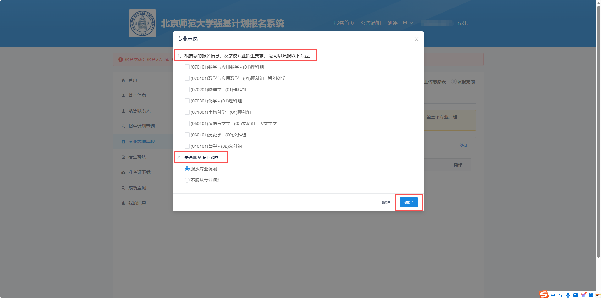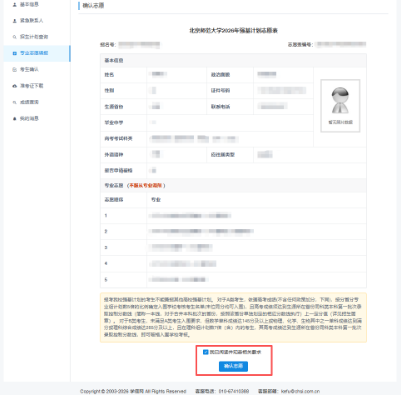 系统将根据前面操作的填写情况自动生成“北京师范大学2026年强基计划志愿表”,考生需仔细核对内容,勾选“我已阅读并知悉相关要求”,然后点击“确认志愿”。