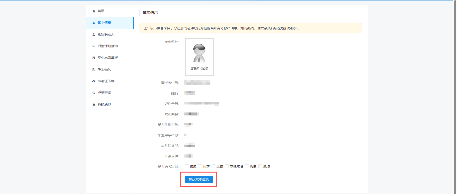 注:“基本信息”页面的信息来自于考生注册的证件号码对应的当年高考报名信息。如有疑问,需联系报名所在地招办核实。