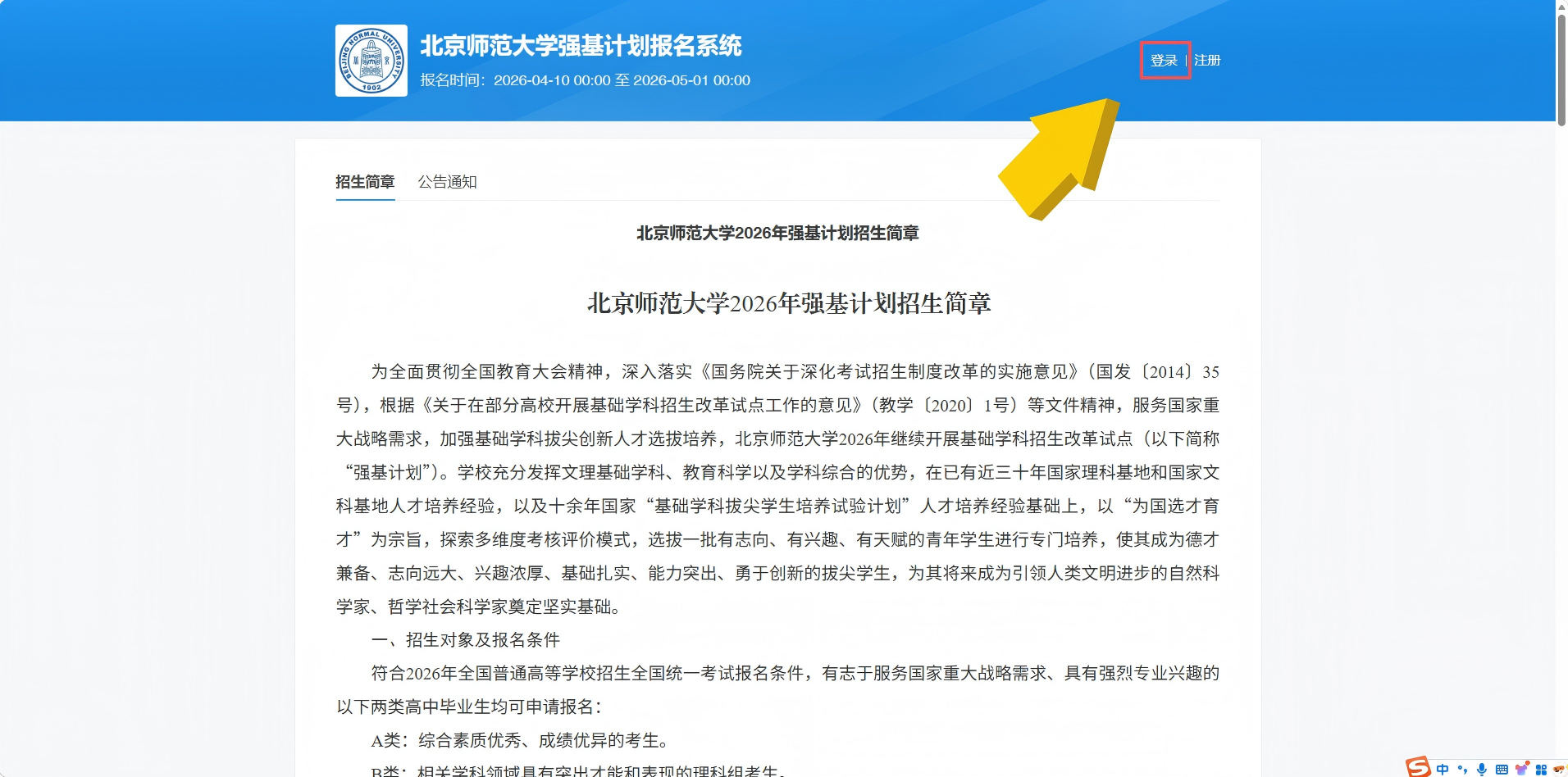 打开北师大强基计划报名系统,点击右上角“登录”键。