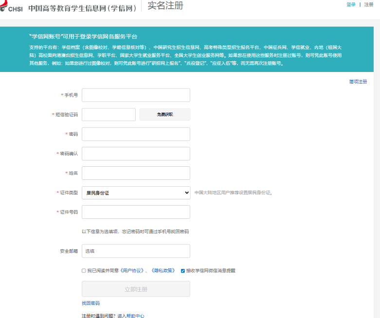 每位考生需使用自己的学信网账号登录报名系统,如没有注册学信网账号,可打开报名系统,点击右上角的“注册”键,完成学信网注册工作。