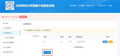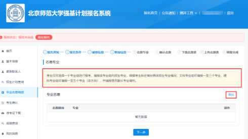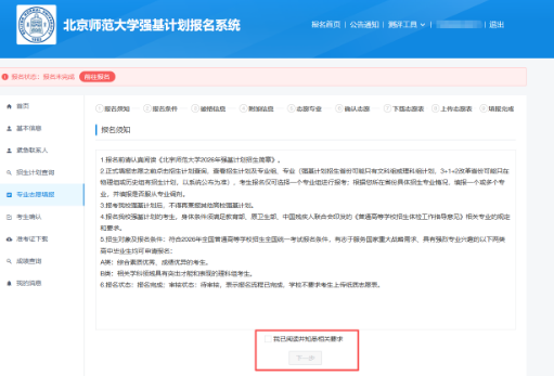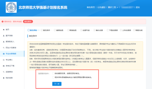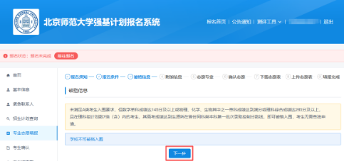 阅读破格信息,知悉破格要求后点击“下一步”。北京师范大学强基计划招生不设置竞赛获奖破格入围。