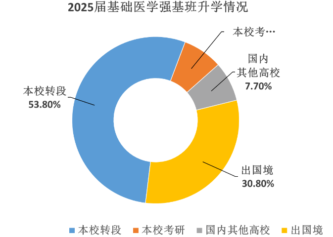 2025届(2020级)首批基础医学强基实验班学生13人(8人本校转段;4人出国境深造,包含美国哥伦比亚大学、纽约大学,香港大学,香港科技大学,1人在读期间在美国哈佛大学开展长期科研实践项目)。2026届强基班19人(16人本校本研转段)。