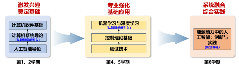 在课程设置上,除热力学、传热学、流体力学、燃烧学等核心课程外,还系统纳入人工智能导论、控制理论基础、机器学习与深度学习、能源动力中的人工智能:应用与创新等内容,突出智能化训练与专业学习的深度融合。