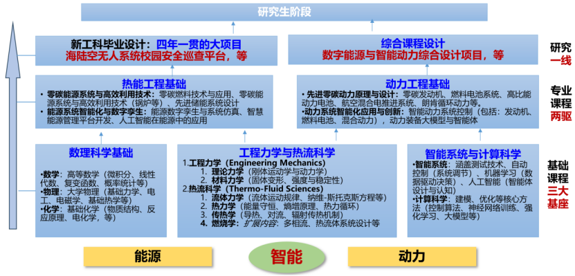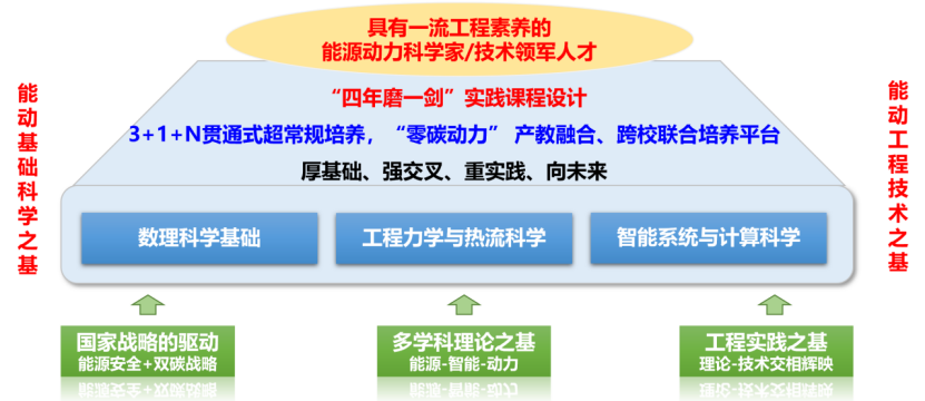 天津大学能动强基将培养体系概括为“一线两驱三基鼎立”。“一线”是能源动力关键问题解决主线;“两驱”是能源与动力两条专业主轴;“三基”是数理科学基础、工程力学与热流科学基础、智能系统与计算科学基础。其核心在于围绕未来问题重构知识结构,推动能源、动力与智能深度融合。