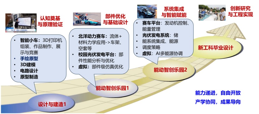 在实践体系上,从“设计与建造”到“能动智创乐园”,再到新工科毕业设计,形成了一条贯通四年的实践主线,强调把知识转化为能力,把能力转化为创造。