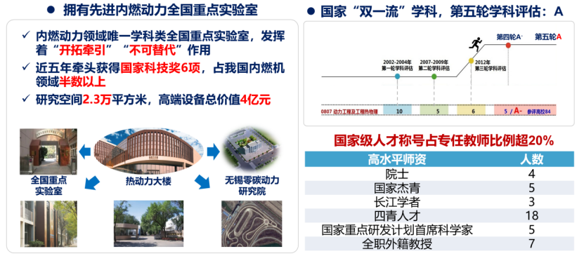 天津大学能源与动力工程学科拥有先进内燃动力全国重点实验室,以及国家级教学实验示范中心、国家“111引智基地”等高水平平台。近五年,学科牵头获得国家科技奖励6项,研究空间约2.3万平方米,高端设备总价值约4亿元;动力工程及工程热物理学科在第五轮学科评估中获评A类,拥有4位院士,国家级人才称号占专任教师比例超过20%。这些条件,为高水平人才培养提供了有力支撑。