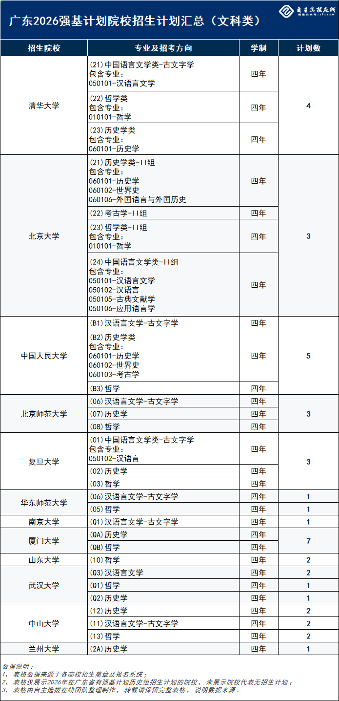 2026年强基计划报名已经开启,在报名前需要了解各个省份的强基计划招生计划数,为了大家更好的了解,今天为大家整理广东省2026强基计划文科组的相关招生计划数据,供大家进行参考!