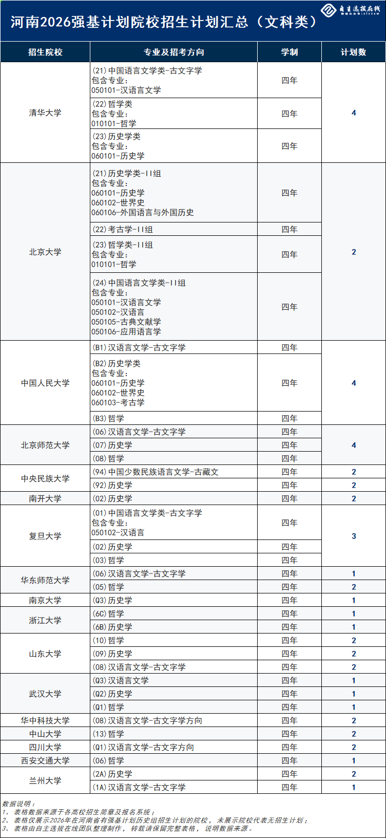 河南省2026年强基计划招生报名已经正式开启,在报名前了解各大院校在河南省的强基招生计划数是很重要的,接下来为大家整理985院校在河南省文科组相关的强基计划招生计划数汇总,大家一起来看!