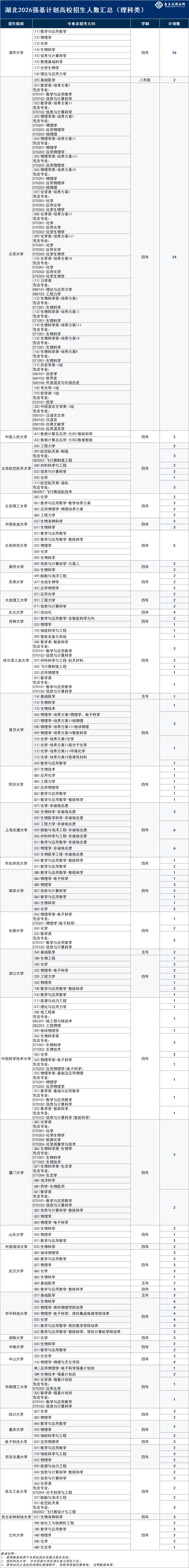 各高校面向湖北理科组招生计划如下: