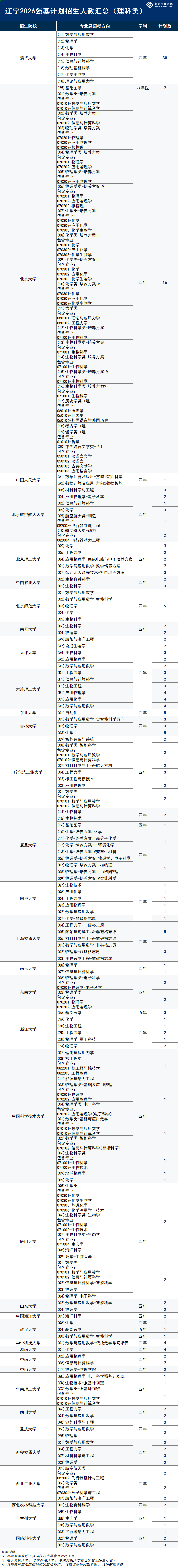 辽宁省2026年强基计划招生人数汇总(理科类)