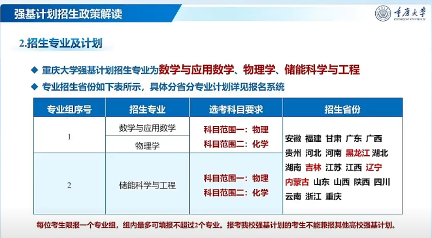 2026年重庆大学强基计划招生专业为数学与应用数学、物理学、储能科学与工程,选考科目均要求物理+化学。三个专业分为两个专业组: