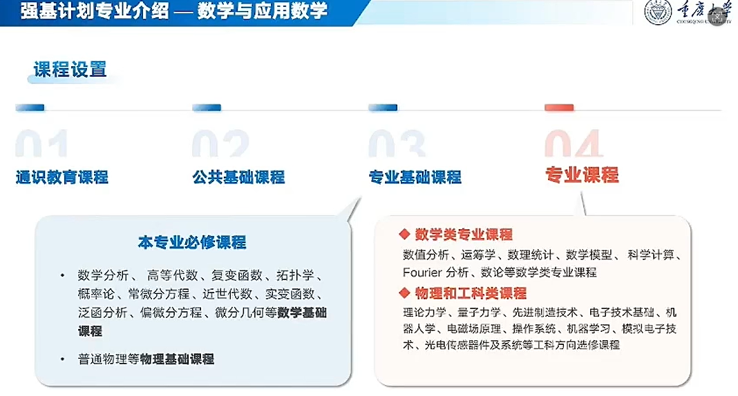 课程特色:除数学分析、高等代数等核心课程外,还开设先进制造技术、机器学习、模拟电子技术等工科选修课,支持学生向交叉领域发展。