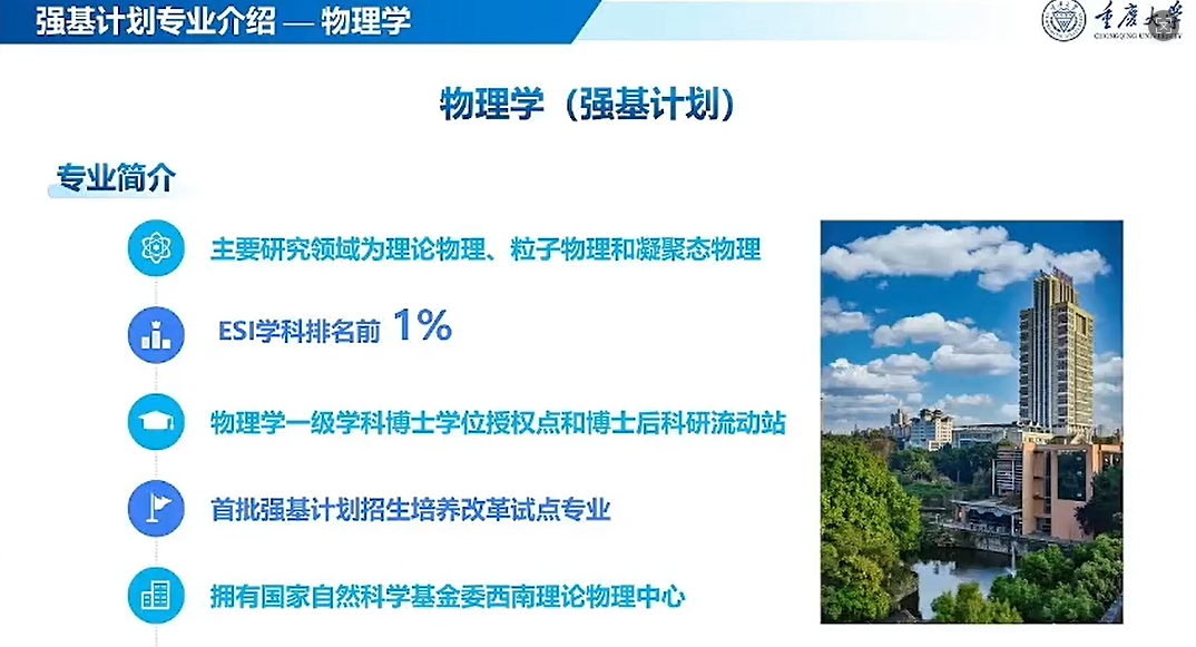 学科实力:办学始于1929年,拥有一级学科博士点、博士后流动站,进入ESI全球前1%,为首批强基计划试点专业,拥有国家自然科学基金委西南理论物理中心。