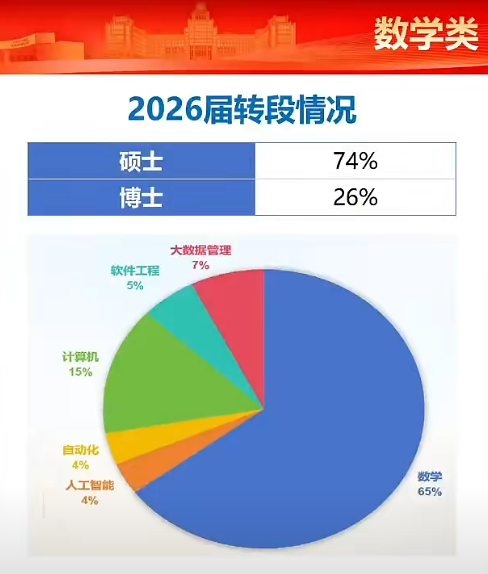 数学类:学科评估A类,100%一流专业。转段方向包括人工智能、高端芯片、软件、自动化、电子等。