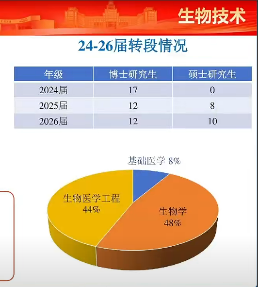 | 生物技术 | 2026届 | 22人 | 54.5%(12人) | 45.5%(10人) | 生物学48%、生物医学工程44%、基础医学8% |