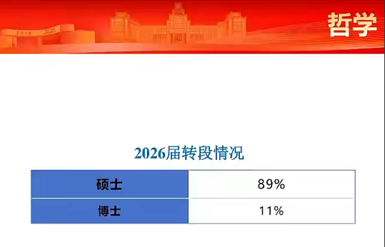 | 哲学 | 2026届 | 全部转段 | 11% | 89% | 科学技术哲学、马克思主义哲学、中国哲学、逻辑学、伦理学、美学等 |