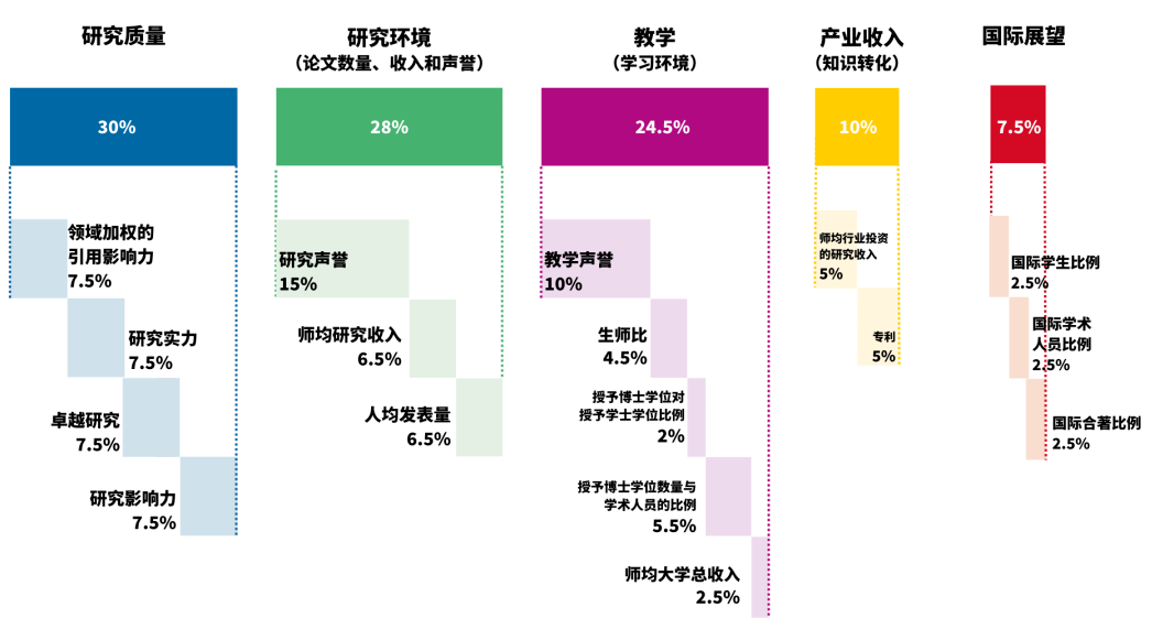 2026年泰晤士亚洲大学排名采用了包括5个大项18个具体指标在内的评价标准。这些评价指标包括如下五个方面:教学(学习环境),研究环境(论文数量、收入和声誉),研究质量,国际展望和产业收入(知识转移)。