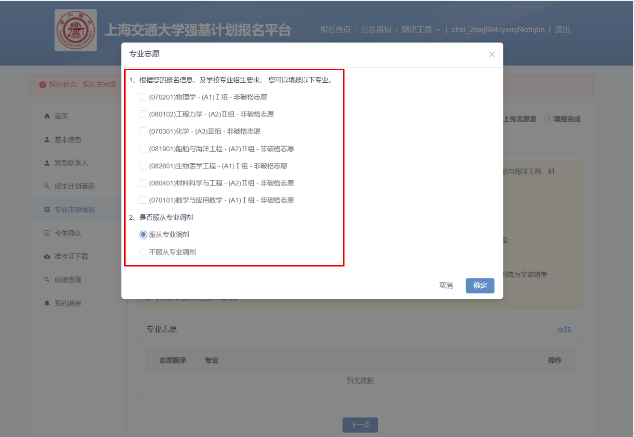 勾选专业组和专业,每位考生最多填报1个专业组别和3个专业。勾选是否服从调剂后点击【确定】。
