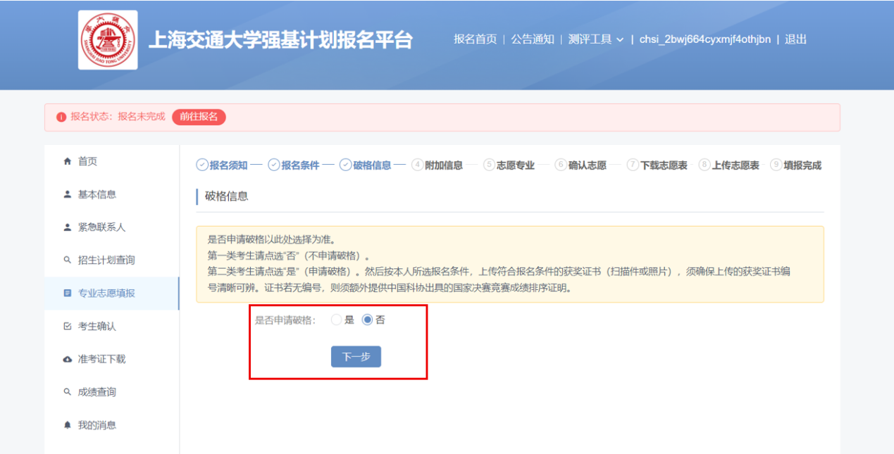 第一类考生点选【否】,第二类考生根据个人需要点选是否申请破格。
