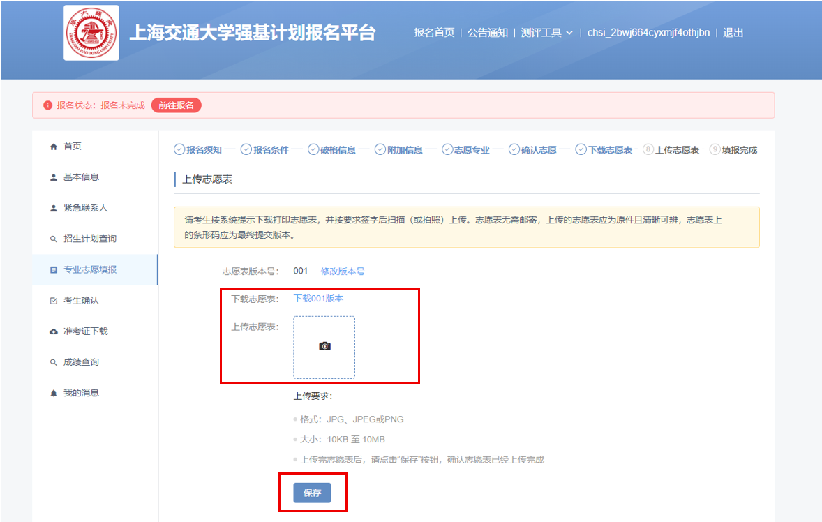 上传志愿表照片(要求为10KB至10MB的JPG、JPEG或PNG格式文件)后,点击【保存】。