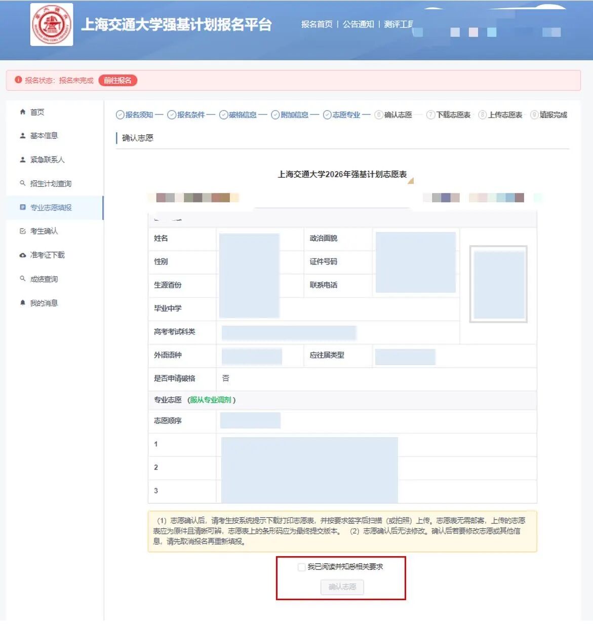 确认志愿表信息无误,勾选【我已阅读并知悉相关要求】,点击【确认志愿】。