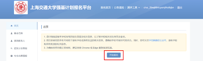 进入报名平台首页后,请仔细阅读黄色底框中的信息,点击【开始报名】。
