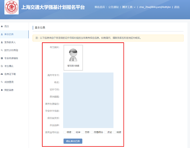点击左侧导航栏的【基本信息】。核对考生基本信息,选择选考科目,确认无误后,点击【确认基本信息】。