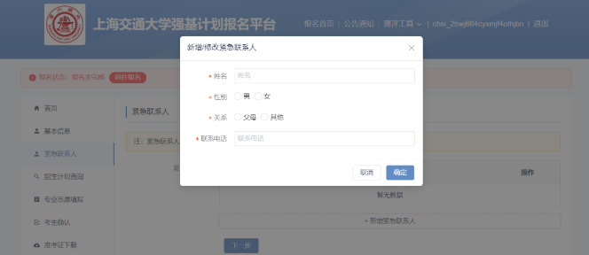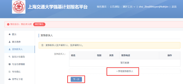 点击左侧导航栏的【紧急联系人】。按要求新增紧急联系人,完成后点击【下一步】。