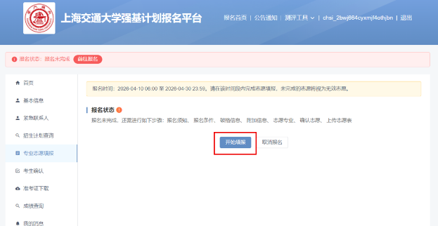 点击左侧导航栏【专业志愿填报】进入填报页面,点击【开始填报】。