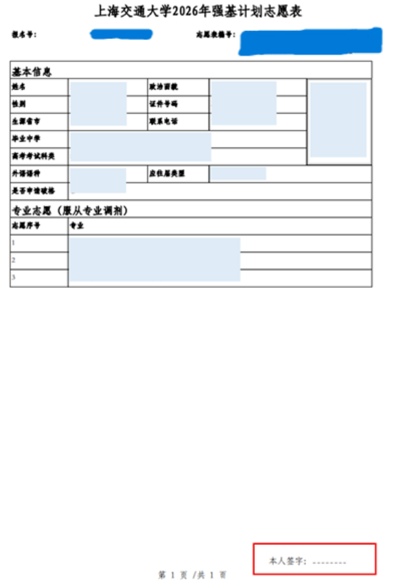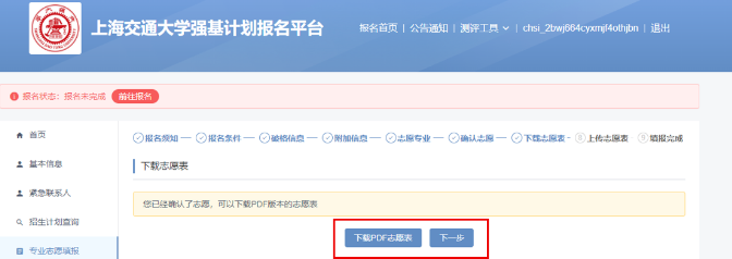 点击【下载PDF志愿表】后,下载并打印志愿表,在右下角本人签字处签字。点击【下一步】。