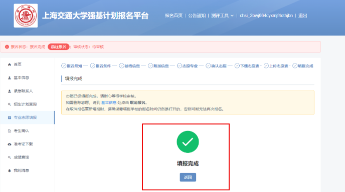 页面显示【填报完成】,左上角审核状态为待审核,视为报名成功。点击【返回】可查看详情或者取消报名。