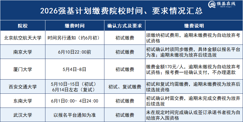 今年有北航、南大、西交大、厦大、东南、武大6校需要进行缴费,西交大还需要进行复试缴费,缴费时间一般和校测初试确认时间一致,最早为厦大、西交大,这两校在5月初进行初试确认和缴费,其余院校在6月进行缴费。