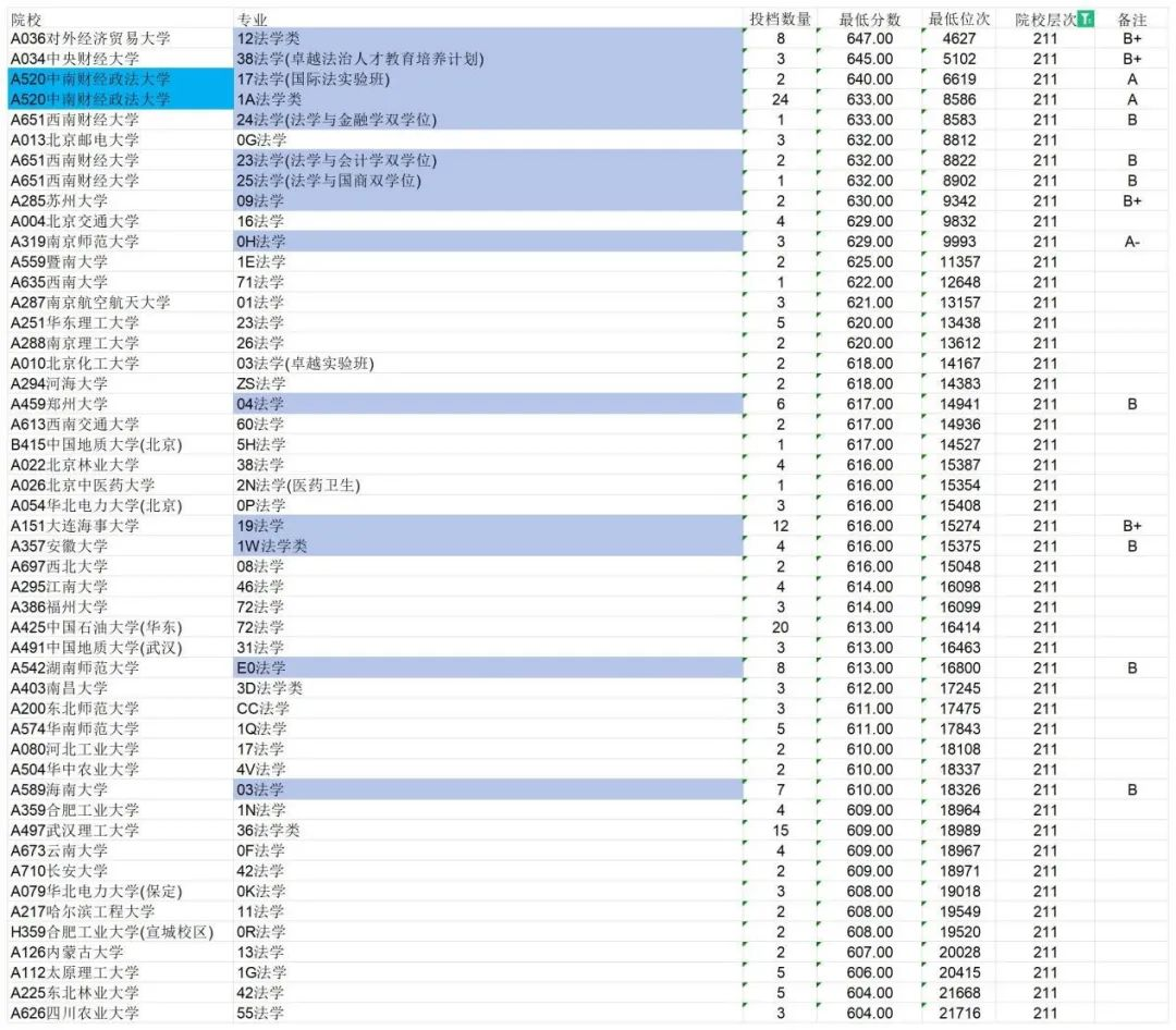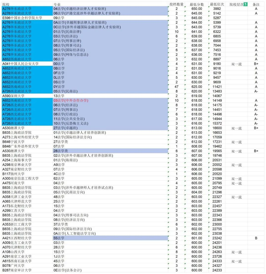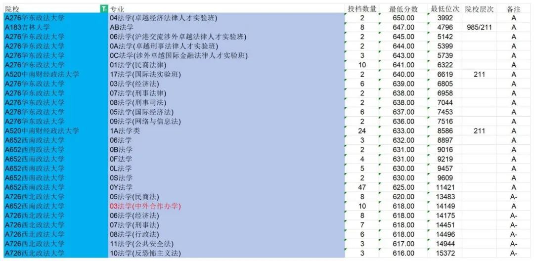 在600-650分的分数段内,学生可以选择华东政法大学、中南财经政法大学、西南政法大学和西北政法大学,以及吉林大学。除了西北政法大学外,其他四所高校的法学学科评级都为A,而西北政法大学的学科评级为A-。具体来说,640分以上的学生可以冲刺吉林大学和华东政法大学的法律人才实验班,625分以上的学生可以考虑中南财经政法大学和西南政法大学,而615分以上的学生则推荐选择西北政法大学。