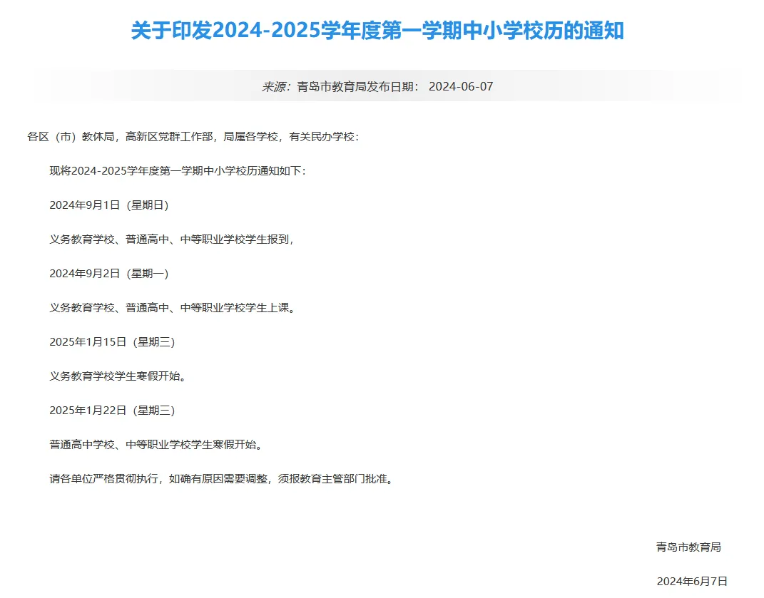 青岛市正式公布了2024-2025学年度第一学期的校历,确认了新学期的开学日期为9月1日。齐鲁家长圈为大家整理青岛市2024-2025学年度第一学期校历,一起来关注一下吧~