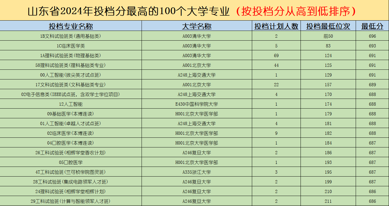 山东省2024年投档分最高的这100个专业都是各高校的王牌专业,具有很高的学术水平和就业前景。以下为热门专业总结: