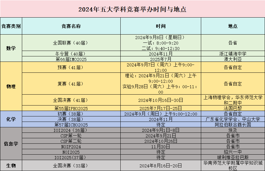 2024年五大学科竞赛时间表
