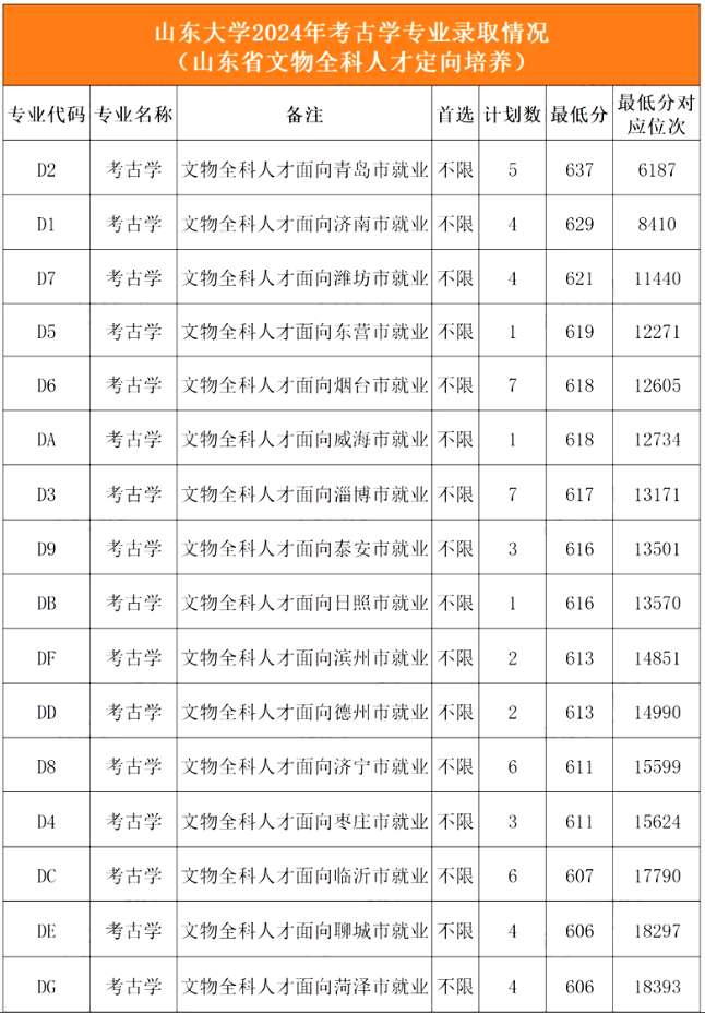 山东大学的考古学定向培养计划今年共录取60人,录取分数线最高的为青岛就业方向,达637分,位次6187;最低的为菏泽就业方向,606分,位次18393。值得注意的是,面向青岛和济南这两个经济发达市的录取分数线更高,甚至超过了一些传统热门专业。