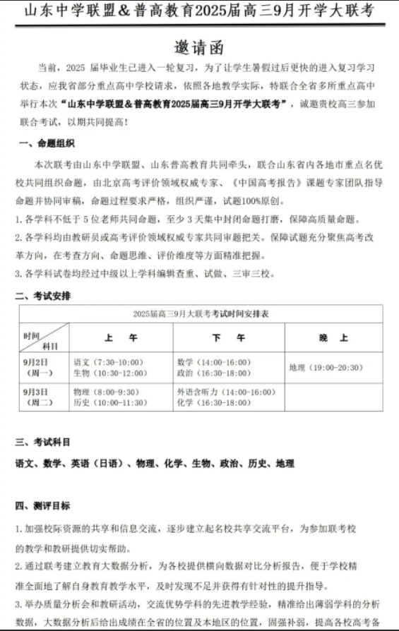 山东普高联合质量测评9月2-3日举行新高三开学大联考,考试科目包括语文、数学、英语(日语)、物理、化学、生物、历史、政治、地理。齐鲁家长圈为大家整理了中学联盟&山东普高联合质量测评9月2-3日开学大联考安排,一起来看看吧!