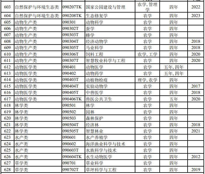 农学门类下有植物生产、自然保护与环境生态、动物生产、动物医学、林学、水产、草学等几类。