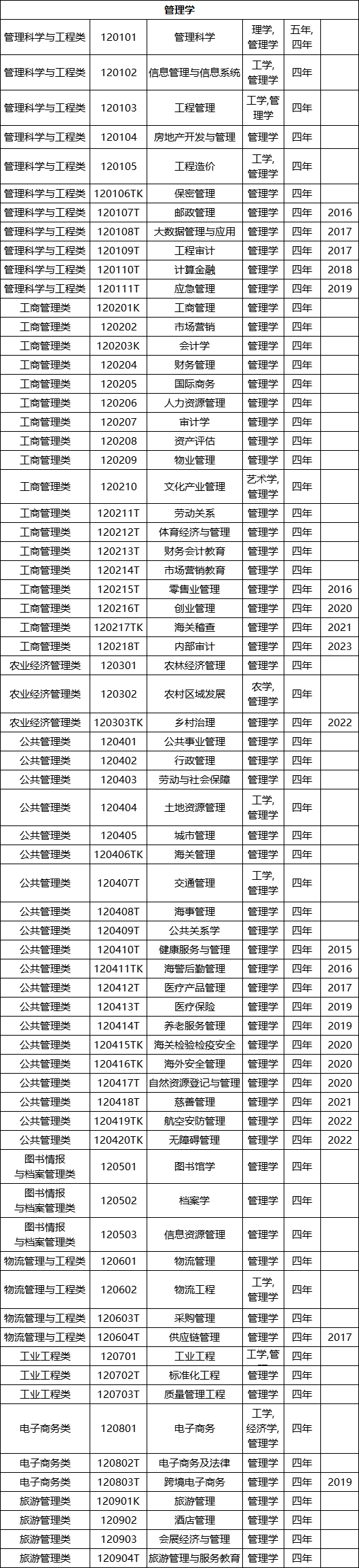 管理学门类下有管理科学与工程、工商管理、农业经济管理、公共管理、图书情报与档案管理、物流管理与工程、工业工程、电子商务、旅游管理等9类。