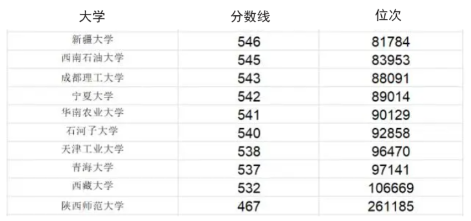 分数最低的10所双一流院校为:陕西师范大学、西藏大学、青海大学、天津工业大学、石河子大学、华南农业大学、宁夏大学、成都理工大学、西南石油大学、新疆大学
