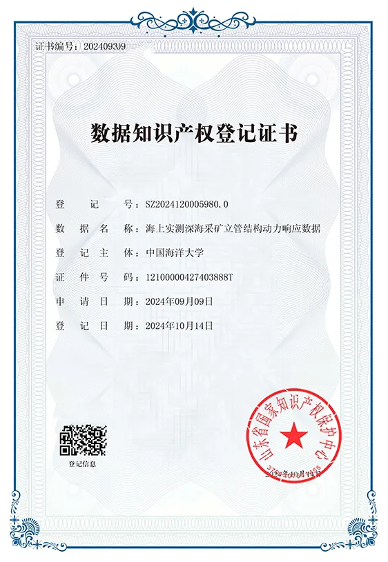 近日,中国海洋大学获得了由山东省国家知识产权保护中心颁发的数据知识产权登记证书,数据名称为“海上实测深海采矿立管结构动力响应数据”。