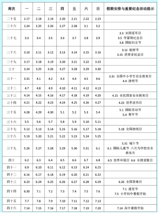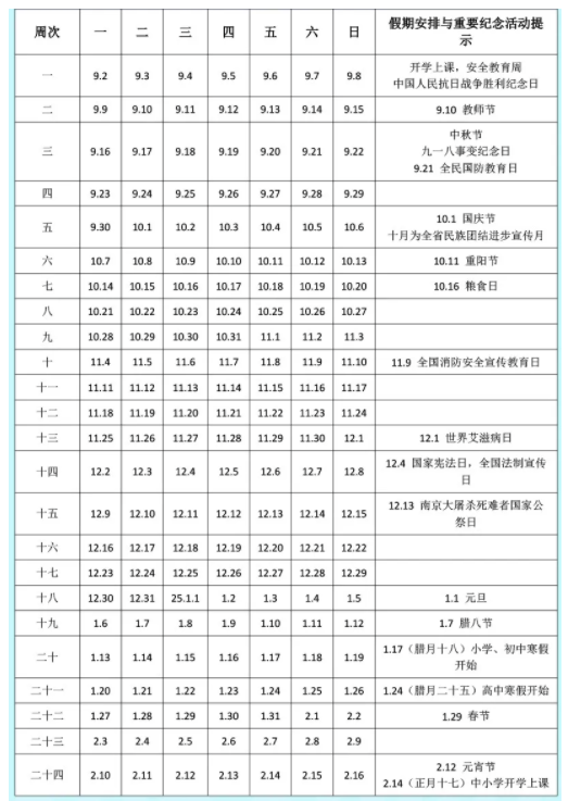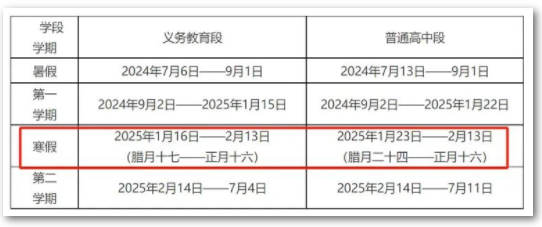 2025年1月17日(腊月18日)小学、初中寒假开始。2025年1月24日(腊月25日)高中寒假开始。