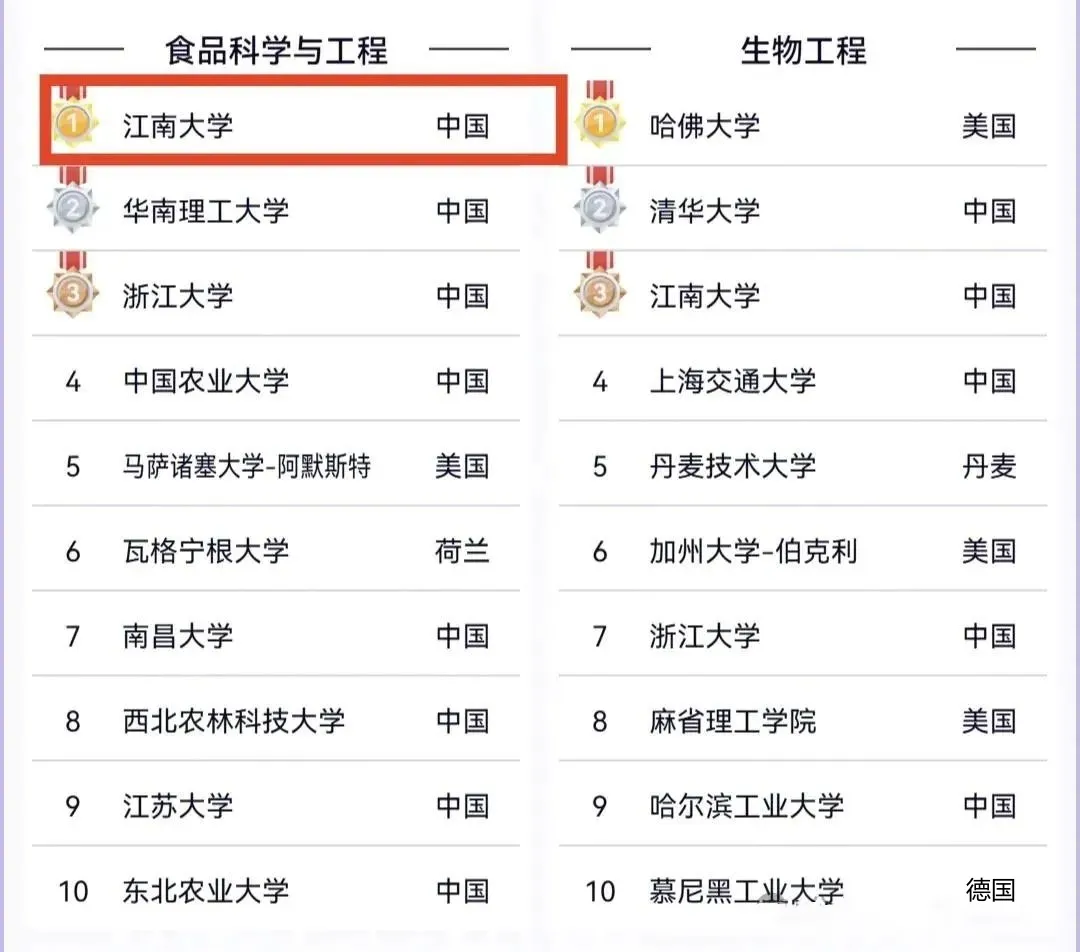 根据软科发布的世界一流学科排行榜,江南大学的食品科学与工程学科夺得世界第一,不仅超越了国内一众985工程建设高校,连很多欧美国家的高校也都望尘莫及。