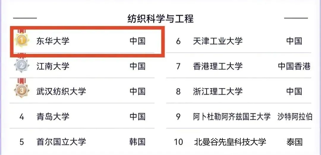 根据软科世界一流学科榜单排名,东华大学的纺织科学与工程学科再次夺得全球第一,另外东华大学还拥有2个国家“双一流”建设学科, 1个上海高校Ι类高峰学科。此外该校的服装设计与工程、材料科学与工程、纺织化学与染整工程、材料学等学科也都极具实力。