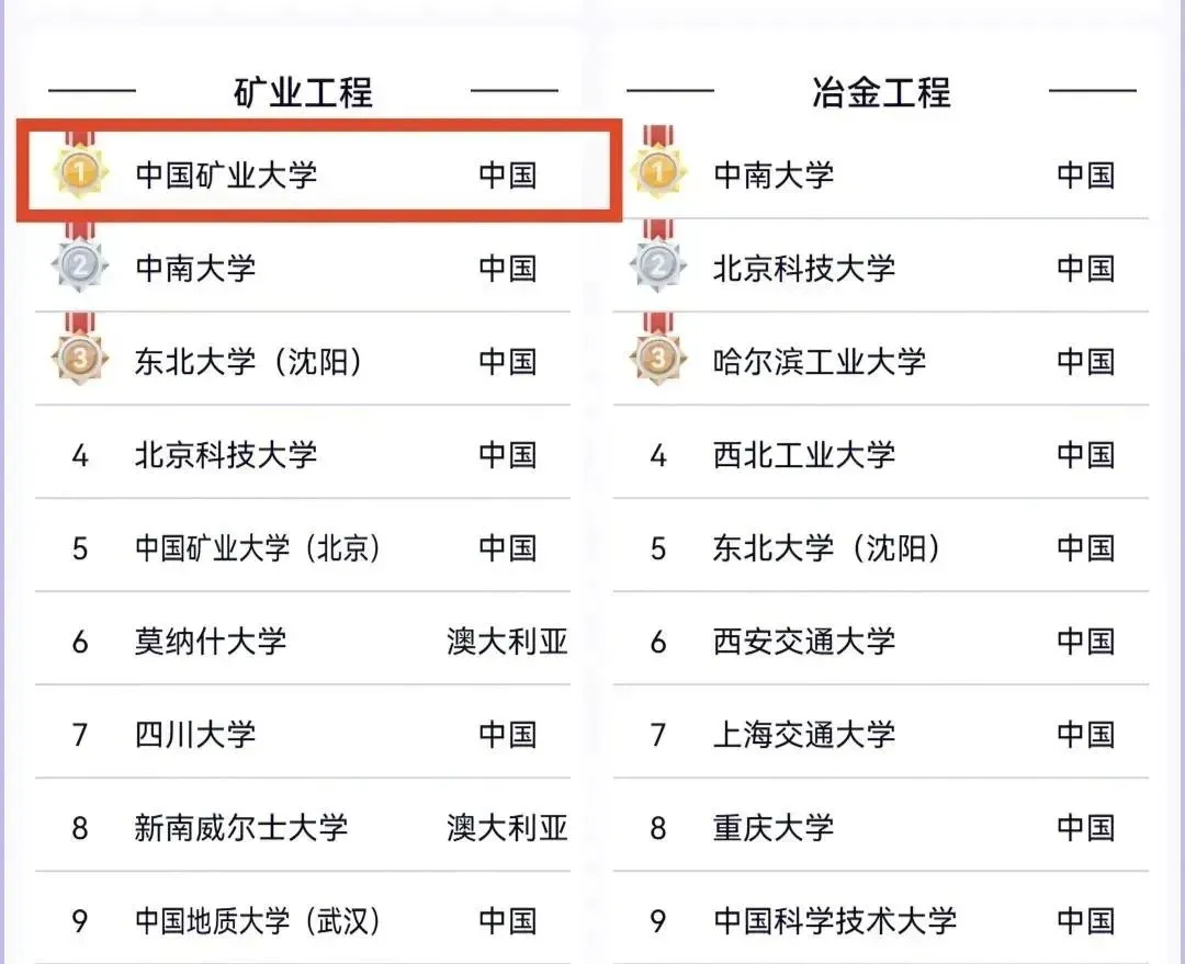 中国矿业大学前身是1909年创办于河南的焦作路矿学堂,后经历中国矿业学院、北京矿业学院等阶段,最终落户江苏省徐州市进行办学。作为我国最早开设矿业领域研究的高校,中国矿业大学的矿业工程学科,已连续三年夺得软科世界一流学科排名榜的首位,超过了中南大学、东北大学等老牌985工科高校。