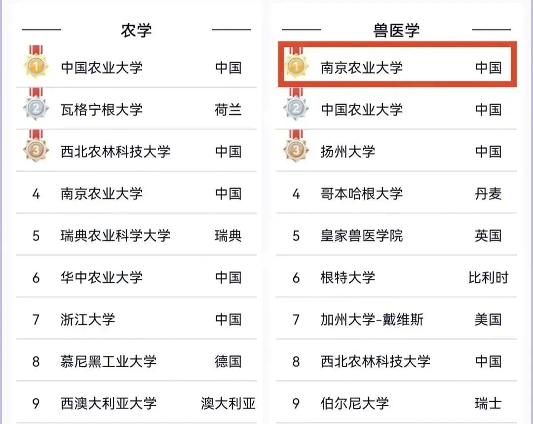 根据软科世界一流学科排行情况显示,南京农业大学的兽医学获评世界第一。而在全国第四轮学科评估中,南京农业大学表现同样抢眼,如植物保护、作物学、农林经济管理、农业资源与环境等4个专业得到A+,位居全国前列。