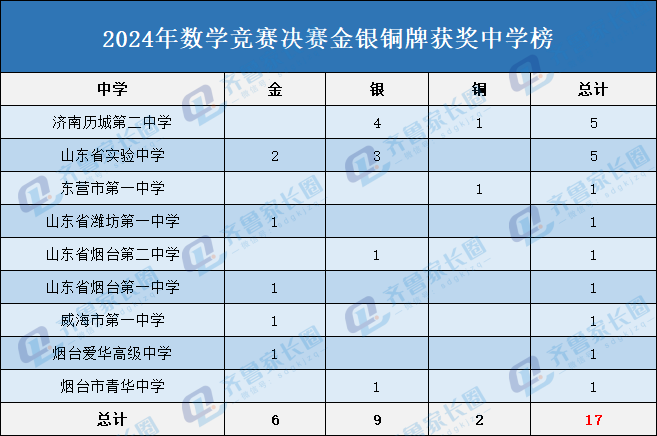 2024年数学竞赛决赛山东省金银铜牌获奖中学共9所,共有17人获奖,包括6枚金牌、9枚银牌、2枚铜牌。